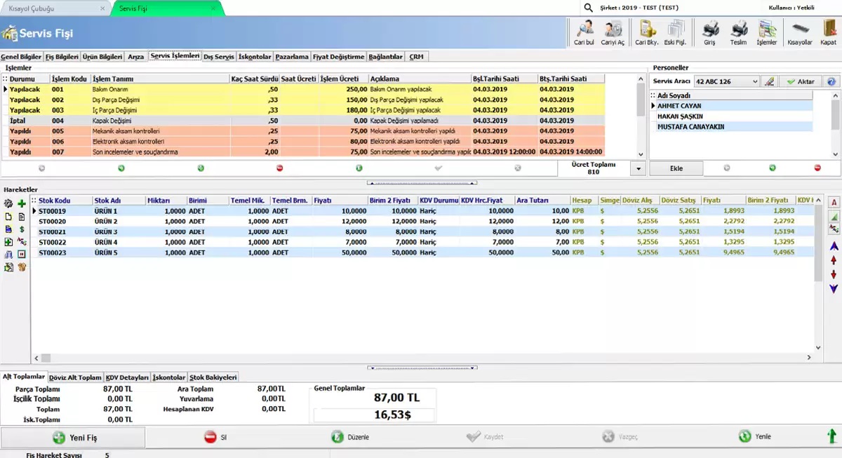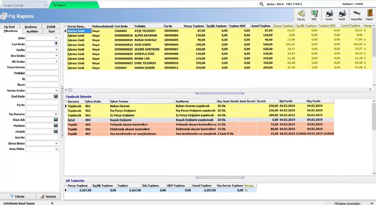 - Servis fişlerinde araç seçerek araçla ilgilenen personellerin iş yüklerini raporlayabilir, iş planını personel ve araç iş yüküne göre gerçekleştirebilir,